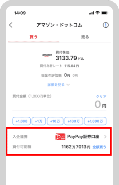 1,000以上の金融機関からチャージして使えるPayPayマネー(PayPayマネー(給与)含む)で、日米株が購入できます。また、株式売却後の売却代金を、PayPayの残高にチャージすることもできます。※1 ※2 ※3 ※4